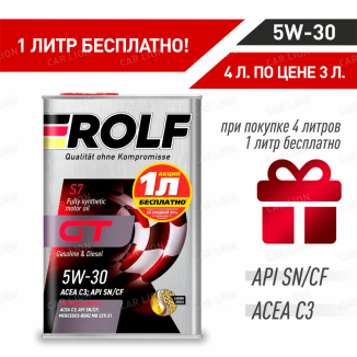 - Акция 4л по цене 3л Моторное масло Рольф(ROLF) GT 5W30 SN/CF C3 синтетическое 4л.