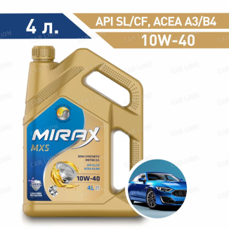 - Моторное масло MIRAX MX5 SAE 10W-40 API SL/CF, ACEA A3/B4 полусинтетическое 4л.